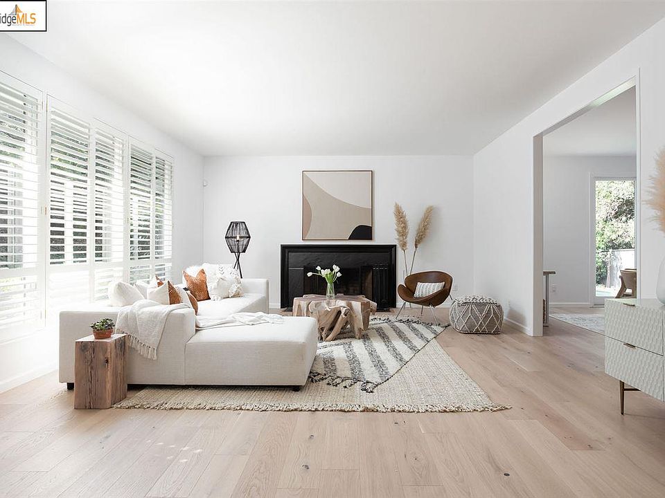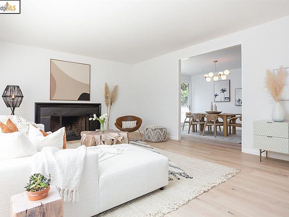Garden Oasis! Gorgeous Mid-century with a level entry to a welcoming flow of living room with a focal-point fireplace, formal dining room, and open family room & eat-in kitchen arrangement, all unified by light, new wood flooring. 3 sliding glass doors seamlessly connect these interior rooms to verdant outdoor living, with swimming pool. Stop to smell the roses, literally! They are luscious and fragrant. The home is tucked into a 1/3 acre parcel, oh so private and peaceful! The bedroom wing is 3 steps up and hosts a spacious owner's retreat with en suite bathroom & dressing area. 2 additional bedrooms with parquet wood floors, a full hall bath & laundry room with door to the garden. All bedrooms overlook a lush garden. The large 2-car garage provides ample storage. The 3rd bathroom serves the swimming pool, no wet feet in the house! The idyllic location at the end of a 3-property cul-de-sac is also conveniently close to both the Piedmont City Center and Montclair Village.