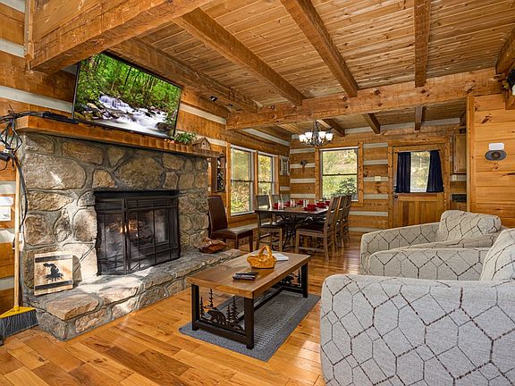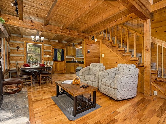 PERFECT LOCATION! This authentic log and chink style cabin is perfectly located off the Spur, 2 miles to Pigeon Forge and 3 miles to Gatlinburg. Whether you choose to purchase as a second home or investment property, you have immediate convenience to all the attractions! The cabin has a private and peaceful wooded view off the back double decks and sits on 1.1 secluded acres. Guests currently enjoy sitting under the covered decks with ceiling fans, relaxing in the hot tub, or building a fire in the large firepit to enjoy the crisp air and beautiful outdoors. Each level of this 3-level cabin has its own King suite for maximum privacy and comfort. There's an additional bunk room located on the main floor for added guests and an open loft with an air hockey table and arcade games for endless entertainment. There are paved roads to the cabin, flat parking, and easy travel without 4-wheel drive. Guests love Cozy Bear, saying, "Super cute and cozy cabin!" "Awesome location! Feels very secluded but you're only a few minutes from the main road," and "Beautiful cabin in a beautiful area!" ***Currently rented through Airbnb privately, so no rental company contracts to deal with. 4.9 star rating! Rented as a 4-bedroom cabin, sleeping up to 12 guests. Projected 2023 income up to $103K.*** ~New HVAC, remodeled bathroom, new appliances, new flooring, and new furniture! Check out the listing docs for a full list. ~Want to build your rental portfolio with 2 cabins? 461 Sassafras Trl is also available!