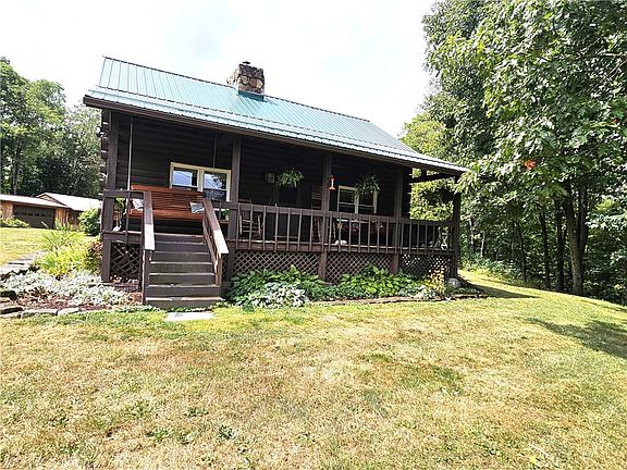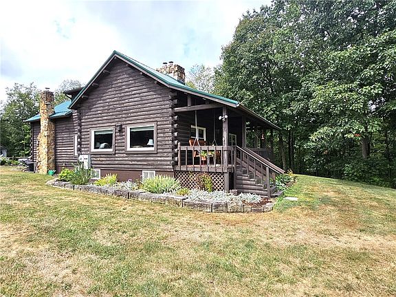 Lovely Log Home on 12+ acres featuring Oak Flooring, Kitchen Island, 2 Stone Fireplaces, 4 Garages, and an RV-Sized Car Port. Large Primary Bedroom with Updated Bath on the Main Floor, a Finished Dry Basement, and 2 additional large bedrooms upstairs. Have a Glass of Wine while You Relax in Your Soaking Tub. Step outside to enjoy the expansive screened front Porch, Ideal for Entertaining or Unwinding after a long day. Or enjoy a Swing on your Covered Back Porch. Stay Comfortable Year-Round with Central Air Conditioning in the Summer and Cozy-up with one of the Wood Burner Fireplaces in the Winter Months. Your Generac Generator will always keep the lights glowing. This Home Combines Rustic Charm with Country Living.
