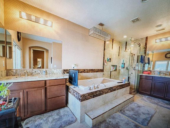 Welcome to Calabria at Monte Sereno. This remarkable 5-bed, 3.5-bath residence with Master Bedroom downstairs is everything you could want in a home, and more! A perfect combination of contemporary comfort and classic grandeur. The sprawling layout boasts more than 3500 sq ft of elegant interior that is sure to impress. Welcoming you into the home is a broad formal living room with stunning wood floors and multiple windows with Custom Shutters that provide the area with natural light at every angle., "MUST SEE” Walk through the corridor to discover a Show-stopping Great Room with Travertine tile, Two-story ceilings, and Eye-catching Gas Fireplace. Adjoining the great room is an Open-Concept Kitchen with stylish Cherrywood Cabinetry, Granet Countertops, a Large Island with Large sink, and a Breakfast Bar with Additional Seating capacity. As you step through the Sliding Glass Door to enjoy the Fully Fenced Backyard that was Custom Designed with Entertaining in mind. Highlighted by a Lovely Paver Patio, Stone Retaining Wall, Firepit, and above ground Michael Phelps Swim Spa. This back yard is one you’ll have to see to believe. New owners are sure to appreciate the Spacious Main Floor Master Bedroom, complete with Huge Walk-in Closet, and Spa-like Ensuite Bathroom with features that include Separate Dual Sinks/Vanities, Deep Soaker Tub, Separate Tile Shower Stall, and Sliding Glass Door that provides Private entrance to the rear of the property. Head up the stairs to see the second floor and all Four Guest Rooms – each with convenient Jack and jill access to Bathrooms, as well as a Theater Room with Hookups for Wall-mount Television and Wired-in Speakers. Other Fantastic Aspects of the property include a Large Laundry Room with a Utility sink and Storage space, an already equipped Security System, Keyless Entry, and RV Hookups for electric and water. Situated in a Desirable Neighborhood, in this Amazing Home! So, don’t miss your chance to check it out while you still can