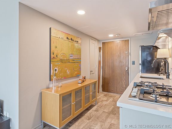 A gorgeous & modern, airy & bright studio on the third floor! Pool-facing side of the South Tower; but nestled in the corner among one of the campus trees for that special touch of nature but w/added shaded & privacy, too! Light gray walls & shear gray window coverings. Be a stand-out among guests w/this like-new / barely used kitchen that boasts all SS appliances, gas cooktop, vent hood, deep sink w/disposal, AND a (rare-in-studios) dishwasher, too! You will love entertaining & hosting w/the ease of a microwave/convection oven-broiler combo, intentionally designed cabinet-depth refrigerator, pantry w/shelving, side buffet in warm Maple, white Corian countertops & stainless open shelving. Glamour galore w/modern luxury vinyl flooring & custom-designed & built-in floor-to-ceiling bookcases w/Murphy bed & mattress. Updated doors & hardware, lighting, & switches. The dressing room / bonus area has a great closet w/storage space, shelving, & clothing rack. The private bath has a huge vanity mirror w/new countertop, toilet, flooring, & modern black faucet & shower head fixtures. It even comes w/a covered parking space of your own and HOA pays all utilities! You will not want to miss this special studio condominium in the heart of downtown Tulsa!