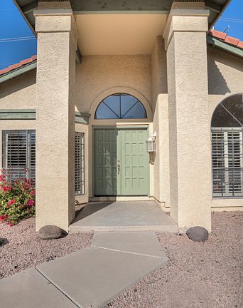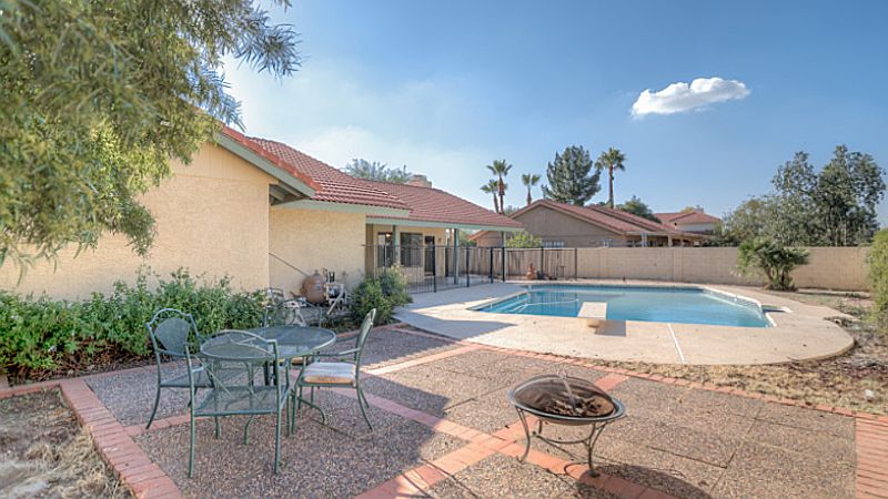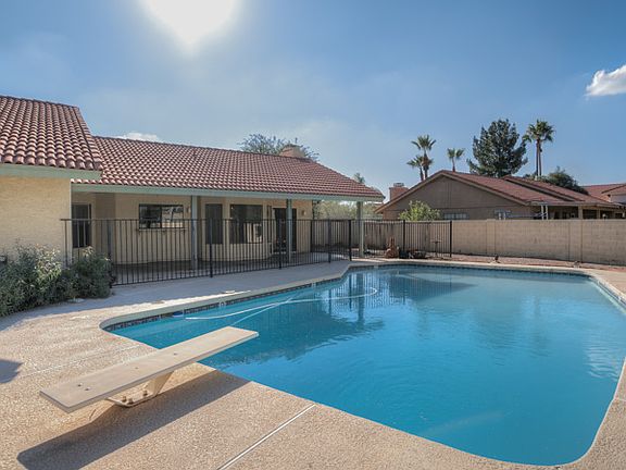 Don't miss your chance to own this single level, 4 bed, 2 bath 2132sf home with a diving pool situated on a premium 10,000+sf lot in the desirable New Horizons Chandler neighborhood with NO HOA! Step through the tile entry into the bright and airy formal living & dining rooms with vaulted ceilings and into the oversized family room with wood burning fireplace overlooking the eat-in kitchen with tile counters, breakfast bar/island & view of the private backyard - no neighbors behind! Master bedroom with ensuite bath, walk-in closet and patio slider sits at the back of the house for ultimate privacy while additional bedrooms and guest bath complete the indoor space. Step outside to enjoy your large covered patio, diving pool & oversized yard with seating area - complete with shed & RV gate..