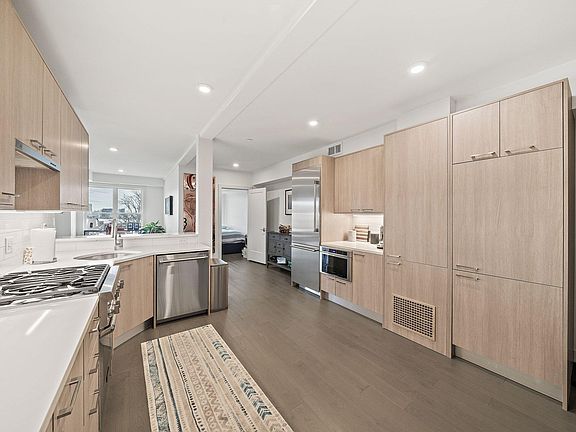AVAILABLE SEPT 1ST. Spacious unit offers an open floor plan with designer finishes and private outdoor space. Unobstructed city & Seaport views. The large, open, kitchen features top-of-the-line Thermador stainless steel appliances, quartz countertops, beautiful contemporary cabinetry, & a large pantry. Hardwood flooring throughout. Entertainers will love the open-concept space with designated dining and living areas, as well as direct outdoor access. The private deck has a direct gas line. The master suite has a walk-in closet and a beautiful spa-style tiled bathroom with an oversized shower. There's a good-sized second bedroom. A smaller 3rd bedroom is directly off the living room & would make a great home office. There is in-unit suite laundry & garage parking. Common amenities include a sky deck with a bar & grill and a recreational clubroom. Enjoy city views from the roof deck and walk out your door to the best South Boston has to offer. Restaurants, shops, and public transportation are just steps away! Renter is responsible for gas and electricity. $1000 security and an additional $500 for a pet security deposit.