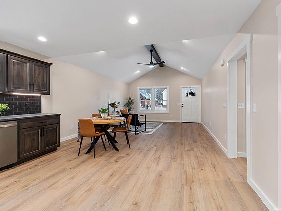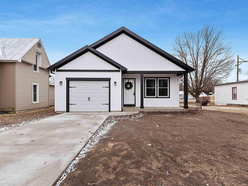 Cozy & Inviting - this fabulous ranch features high ceilings, large open concept, split bedroom floor plan ! Did we mention it’s new construction!? Stunning new build completed in 2025 by B&B Home Builders with quality craftsmanship & attention to on-trend details including black leathered granite counters in kitchen and baths, wide plank flooring, beautiful lighting fixtures, walk in pantry, Craftsman style trim and doors, custom tiled showers with amber tinted glass shower doors. Have you been wanting a home without the hassle of super long drive? Warsaw & Goshen are 15 about mins away, Syracuse 5 mins. This 3 bedroom, 2 full bath home has lots to love & much to offer with over 1200 sqft of living space. Charming from the moment you arrive, the attractive white exterior with stunning black trim screams curb appeal with a modern aesthetic, 2 covered porches in the front and rear, and attached 1 car garage with Keyless entry garage pad. Inside the front door you’ll find a bright & welcoming atmosphere complemented by luxury vinyl plank flooring , maple wood beam in the living room matched directly to the cabinets, GE slate appliances fridge, dishwasher, microwave and slide in range , under cabinet lighting in kitchen & crisp neutral walls, with elite decor elements adding character & ambiance from the fashionable lights down to the hardware! Generous primary bedroom has ensuite with custom tile shower, black leathered granite countertops, double vanity sink, and walk in closet with ample hanging space. The remaining 2 bedrooms are both comfortably sized & in same hallway as main shared full bath with tub/shower combo. Main level laundry room and mudroom is just off the garage with built in cubbies, coat and bench area. Back porch overlooks expansive fenced in backyard stretching back to the oversized 38’X28’ detached 3 car garage with 2 overhead doors, perfect for storage or a workshop. Ample room for all kinds of outdoor fun & activities. Don't miss this amazing opportunity—reach out today!