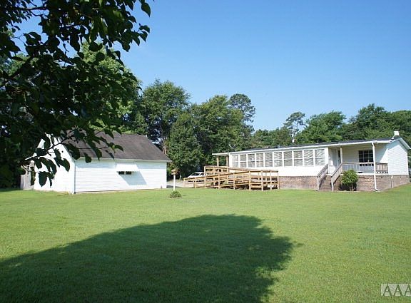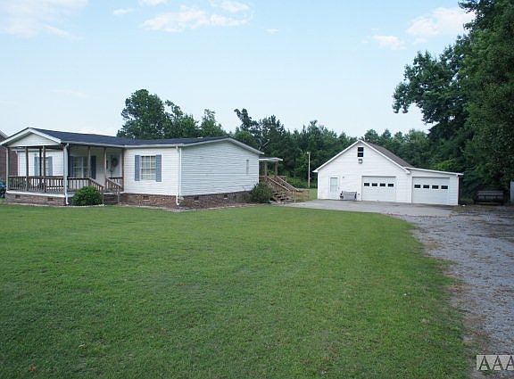 Single Family Doublewide Trailer completed bricked underneath with built on porch and detached garage in excellent condition new roof, new AC unit.