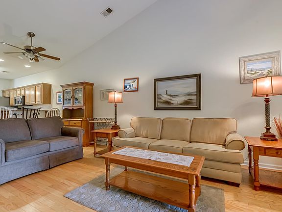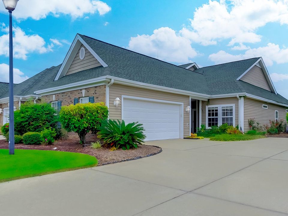 Southern Living at Its Best! Lovely, updated 3 bedroom, 2 bath ranch condo with attached 2-car garage nestled in the Park West community, across from the pond with fountain and a private backyard. This end-unit condo is all on one level and offers all the advantages of a single-family home without all the maintenance responsibilities. An oversized driveway and private two car garage are just the beginning. Walk to your front porch with room for a cozy seating area. Enter the unit to soaring cathedral ceilings and wide-open living. Spacious living room and dining area with attractive hardwood flooring, high vaulted ceilings and newer ceiling fan. Large, updated kitchen with newer stainless-steel appliances, granite counters, tile backsplash, work island, ceramic tile floor, bright and cheery breakfast nook with windows, breakfast bar with expanded countertop, pantry and lots of counter space. Separate laundry room with LG washer & dryer that convey and shelving. French doors from the living room lead to the large master bedroom suite with walk-in closet, hardwood floors, fan and windows overlooking the private backyard. Double-door access from the bedroom lead to the remodeled master bath with double sinks, tiled walk-in shower with transom window, tiled jetted tub, tile floors and linen closet. Two good-sized guest bedrooms at the other end of the home afford privacy and ample space for family and friends. The guest bedroom, currently used as an office, features hardwood floors, ceiling fan and windows overlooking the front yard. The 3rd bedroom has laminate flooring and a ceiling fan. The guest bath has been beautifully updated with stunning tiled shower with transom window, painted vanity, newer mirror, raised commode and tile floors. Attractive French doors from the living room open to a large enclosed 3-season porch overlooking the wooded backyard. Features include newer Eze breeze windows, newer carpet, custom shades, ceiling fan and an electric heater, for those chilly fall and winter evenings. Start your day here enjoying your favorite morning beverage, listening to the birds or just relaxing and enjoying nature at its best. Or better yet, head outside to the patio – the perfect spot for grilling, entertaining and building memories with family and friends. Attached 2 car garage with newer overhead garage door opener system and pull-down stairs leading to attic storage. New roof installed by the HOA (2022 or 2023), HVAC (2015) and newer storm door on front entryway. The beautiful blue Atlantic is just a short drive away! No worries if you are not in the mood for a day at the ocean and sand in your toes! The community pool will be a great spot to take a quick dip and cool off on a hot summer day. HOA fee includes basic cable, water & sewer, external termite control, exterior insurance & maintenance on the building, landscaping/lawn care, common area maintenance, pool. Close to restaurants, golf courses, shopping, hospital, Murrells Inlet Marsh Walk, Brookgreen Gardens and Huntington Beach State Park. This move-in ready home is not only attractive but practical, efficient and functional. Make an appointment to see – a great lifestyle awaits you! Measurements and square footage are approximate and not guaranteed. The buyer is responsible for verification.