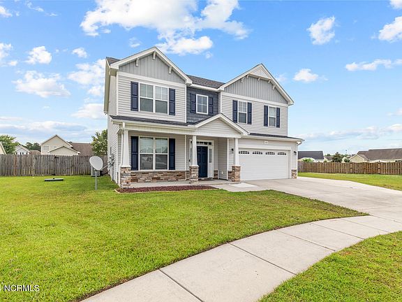 Welcome to Sterling Farms! This beautifully maintained 4-bedroom with bonus room and 2.5-bathroom residence is ready for you to move in. With its spacious and versatile layout, this home offers everything your family needs and more. As you step inside, you'll be greeted by a formal dining room and a cozy front sitting room to your left, perfect for entertaining guests or enjoying a quiet moment. The open concept kitchen, equipped with stainless steel appliances, flows effortlessly into the large living room, providing a warm and inviting space for family gatherings. The living room features a fireplace, ideal for those cozy winter nights. Upstairs, you'll find four generously sized bedrooms and a bonus room, making it easy to work from home or accommodate guests. The master suite is a true retreat, boasting a huge walk-in closet and a luxurious master bath with a separate shower, bath, and double vanity. Convenience is key with an upstairs laundry room, ensuring your chores are a breeze. Step outside to discover a covered back porch leading to a spacious, fully fenced backyard complete with a firepit - perfect for outdoor entertaining all year round. This home also includes a large two-car attached garage and central air throughout for your comfort. Located just a short distance from Camp Lejeune and the air station, this home is perfect for military families. Contact us today to schedule a showing and make this house your new home!