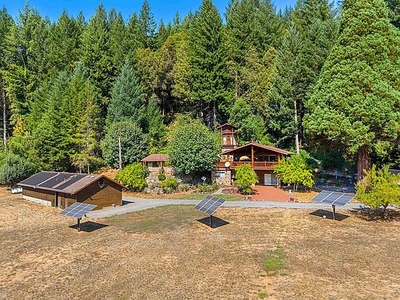 Off-Grid Vineyard Oasis with Pool, Solar Power, and Airbnb Potential.. Welcome to your dream off-grid escape—where luxury, sustainability, and income opportunity all come together. Set on over three and half beautiful acres, this one-of-a-kind property offers privacy, character, and endless potential. Whether you're looking for a peaceful retreat, a profitable Airbnb, or your own boutique vineyard, this estate delivers. The home is full of rustic charm and warmth, featuring myrtlewood interior walls, beautiful engineered hardwood flooring, and expansive windows that flood the space with natural light. With three bedrooms and four full bathrooms, the home is ideally designed to function as either a spacious single-family residence or a dual apartment-style setup. Each level has its own kitchen access, bedroom, and private entrance—making it perfect for hosting guests, extended family, or short-term rentals. The pool area is an entertainer’s paradise, featuring a deep 9-foot Pebble Tec pool with a water slide and a custom mural. Nearby, you'll find a wet bar and plenty of space to relax or entertain. The historic water tower has been thoughtfully converted into a charming bunkhouse, adding to the unique character of the property. The vineyard is a true gem, with four grape varieties including Cabernet, Merlot, and Muscat. The vines can produce up to 400 bottles of wine per year, and the sale includes all the equipment you need—grape press, carboys, vats, and more. There's even a dedicated space for bottling, making this property ideal for aspiring winemakers or wine enthusiasts. Power won't be a concern here. The home is fully off-grid, powered by a robust solar system including 36 panels with two large inverters, a battery backup room, and a diesel generator. There are two wells on the property, including the highest-producing well in the area. Heating is handled by a wood stove upstairs and a monitor heater downstairs, while two on-demand hot water heaters ensure comfort year-round. The detached garage is a standout feature, offering over 2,000 square feet of space, room for three cars, and additional storage or workspace. The large deck overlooking the property has been redone in the past 10 years and features beautiful log railing work, providing a perfect spot to enjoy peaceful views and fresh air. With so much to offer—location, privacy, solar power, income potential, and unmatched charm—this extraordinary off-grid property is ready to welcome its next chapter. Airbnb, hobby vineyard, or private retreat? The possibilities are endless.