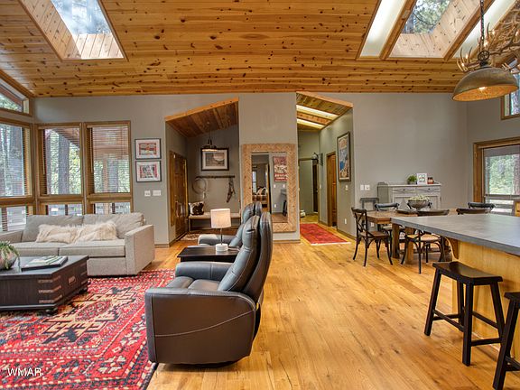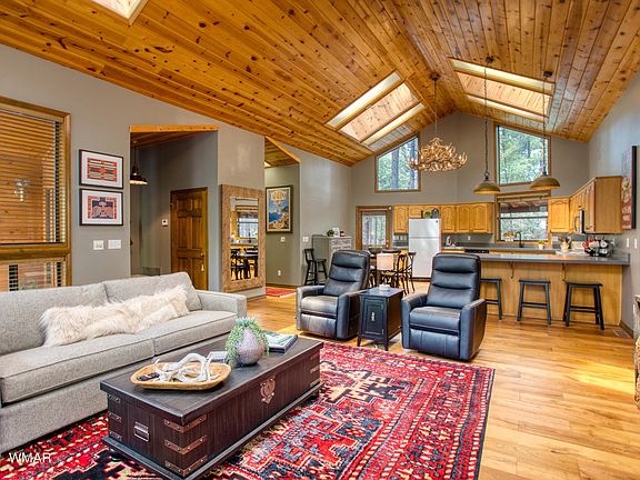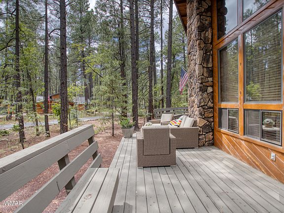 Great opportunity to live in the beautiful White Mountain Summer Homes! Amazing cabin with open floor plan, abundance of natural light, vaulted ceilings and skylights. Huge owner's suite & split bedrooms. Front and back decks with built in seating and fire pit area in backyard. Epoxy garage flooring & landscaped. Close to golf, skiing, hiking, fishing and more... this is the ONE you must see for your mountain escape! Furnishings & golf cart available on separate bill of sale. WMCC membership is not included in HOA.