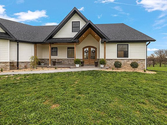 Modern Farmhouse For Sale in the Ozarks! This property on 3 acres with a custom built home in 2019, is located a short distance from town in a country setting; offering 6 bedrooms and 5 bathrooms the beautiful front double doors welcome you into this open concept home with 18 ft ceilings in the living room. Featuring fireplace with custom built-ins on each side and large windows letting in lots of natural light. The doors from this area lead to the outdoor deck to enjoy the spacious yard. The kitchen has granite counters, stainless steel appliances and HUGE island for extra seating with dining area. Located off the kitchen is the ''Pantry of your Dreams'' This large room with multiple shelves for storage even includes a desk area for you or your kids. At this end of the home there is a full bathroom in the hall, large utility room and the Master Suite. The Master Bath with walk-in shower, soaking tub, two vanities also include a walk-in closet. At the other end of the home, you have 3 bedrooms (one includes a jack and jill full bathroom with walk-in closets) and another full bathroom for the additional bedroom. A large staircase takes you to the lower level with massive family room area to make into whatever your heart desires. Lower level also includes 2 bedrooms, full bathroom, safe room and office/workout area. The patio located off the living area is great outdoor space. The home has MANY custom extras throughout such as surround sound on both levels, zoned heat and air, 3 car attached garage and more! Don't miss out on this opportunity for a quality constructed home with amazing style and floor plan! Call for your appointment to View.
