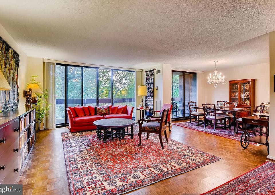 Dramatic colors, wonderful space & shining parquet floors. This 2 bedroom, 2 bath has recently replaced sliding glass doors & windows. The two baths are updated and attractive. The deck overlooks the treetops of Guilford. Kitchen is simple with room for a table and chairs, and a washer & dryer. One car garage space. What a wonderful place to call home. Enjoy the pool in the summer, attractive common areas and a full service building. A very sophisticated space in a prime urban location. All utilities included