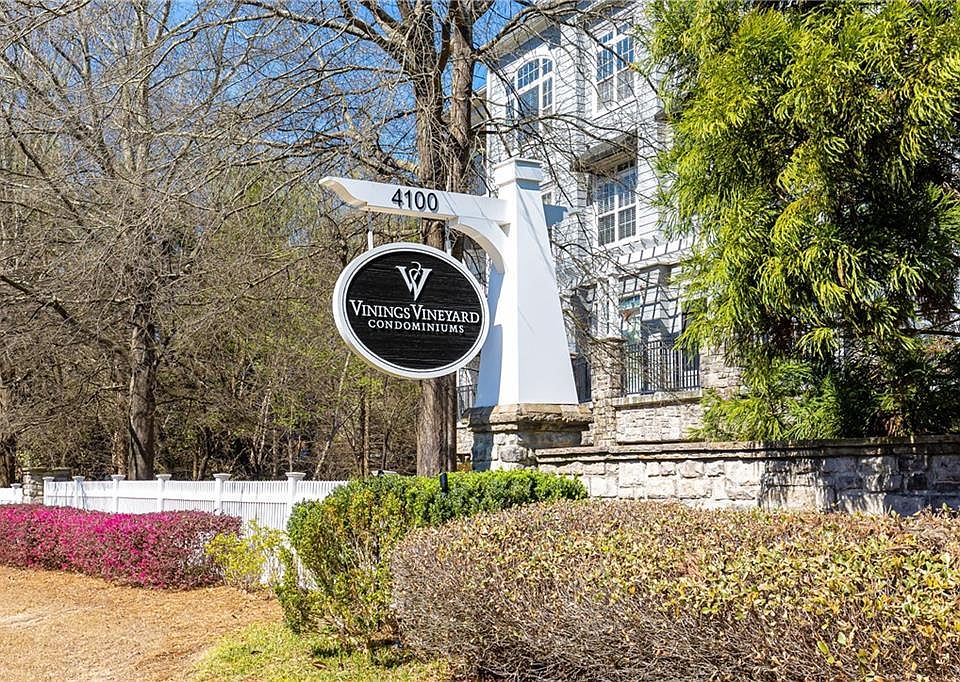 Spacious ground level 2/2 in convenient and gated Vinings Vineyard! Kitchen features a breakfast bar + newer stainless steel appliances, and is open to living room. Large pantry in kitchen provides plenty of storage. Kitchen is open to fireside family room that leads to large patio with pool views. Large separate dining area.Primary suite features 2 closets and large ensuite bath w/ double vanity and separate tub/shower. Large secondary bedroom w/ spacious bathroom and walk in closet. Laundry in hall. Upgraded flooring throughout and neutral paint means this home is move in ready! Vinings Vineyard amenities include pool, fitness center, walking paths and more, and the community is gated w/ secured entry to buildings. Prime Vinings location convenient to major interstates, Truist Park, The Battery, Vinings Jubilee, grocery stores, restaurants, hiking trails, and more! Cobb taxes!