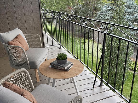 North-facing unit overlooking evergreens, updated summer 2025--freshly painted balcony, freshly painted unit, new carpeting, updated hardware; common laundry and storage near the unit.