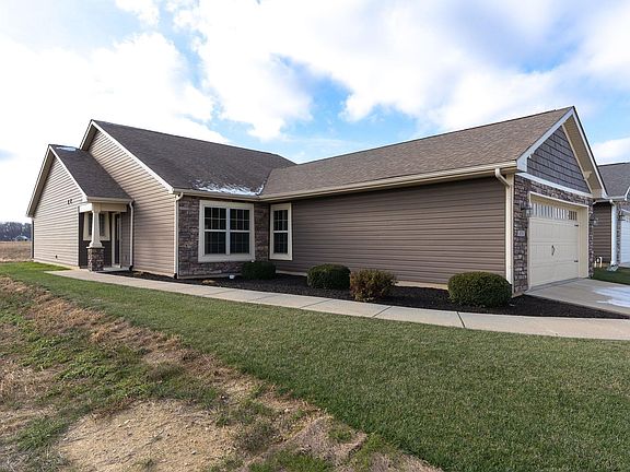 Care free living at its finest. This 3 bedroom 2 bath home is located in The Stonehenge Executive Village where all your lawn care and snow removal are maintained by the HOA! Along with the lawn care you have access to a beautiful clubhouse, swimming pool, splash pad, volleyball court, fishing pond and more! Enjoy all this along with the comfortable amenities this home has to offer including open floor plan with sun room, kitchen with granite counters, tile walk in shower in your primary suite and cozy fireplace in your spacious great room. To top off this great home, all carpet is brand new!