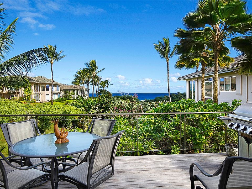 Experience luxury living in Princeville's newest community, Ka'iulani of Princeville. #21 is a premier unit set along a tropical valley bluff with direct views of the Pacific, Anini Reef and white water. Take in the sights and sounds of the ocean or enjoy seasonal whale watching through an impressive, 2-story wall of glass or from your private lanai. With nearly 3,000 sqft of air-conditioned living, #21 offers a spacious open floor plan with vaulted ceilings and upgraded, low maintenance flooring: Travertine and beautiful hardwood. Enjoy top-of-the-line appliances including a Wolf gas cook top, a large center island and eat-in breakfast nook in the chef-worthy kitchen. Additional cabinetry and bar space wraps into the ocean view formal dining area. Attached 2-car garage, large guest suite (serves as a second master suite), laundry room and half-bath are also located on the ground floor. On the lower level, discover the second living area with fireplace, built-in wet bar (complete with sink and mini-fridge) with the same fantastic views. The grand master suite featuring a spa-style bathroom with zen garden and water feature, along with the third guest bedroom / bathroom are also located on the lower level. #21 is being offered fully furnished, as a turn-key vacation rental (minimum 30-day stays) but would also make an excellent primary residence or second home. Other upgrades include: sound system throughout with in-room controls, on-demand water heater, gas dryer and a large, Travertine-tiled bonus storage area. Ka'iulani resort-quality amenities include: 3 terraced pools (heated), a large lava rock Jacuzzi spa, covered pavilion for gatherings and Wolf BBQ's. Minutes away from fine dining, shopping, golf and a number of the north shore's best beaches!