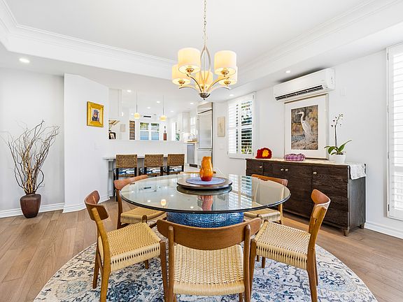 Interior highlights include reclaimed teak hardwood floors in a driftwood-gray stain, tray ceilings, crown molding, Hunter Douglas wood shutters, soft-close cabinetry, Kohler fixtures, and Legrand dimmable lighting controls. Mini-split AC units service the bedrooms, kitchen, and living/dining area, complemented by multiple ceiling fans. Both bedrooms include flush-mount pop-out outlets at each nightstand.