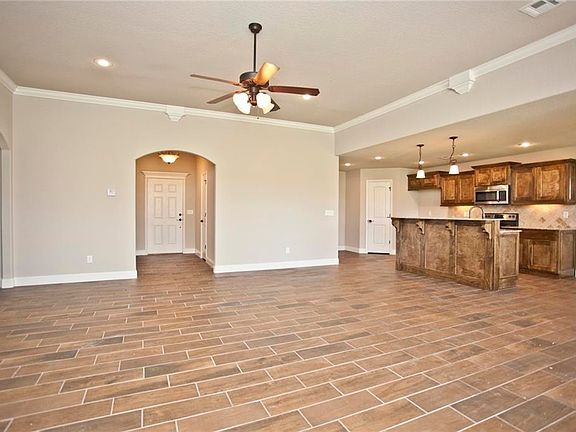 This 3 Bedroom, 2 Bath, 2-Car Garage home features all brick exterior, wood-look tile flooring, custom cabinets, pantry, crown molding, raised ceilings, sodded yard, covered patio, and Much More!