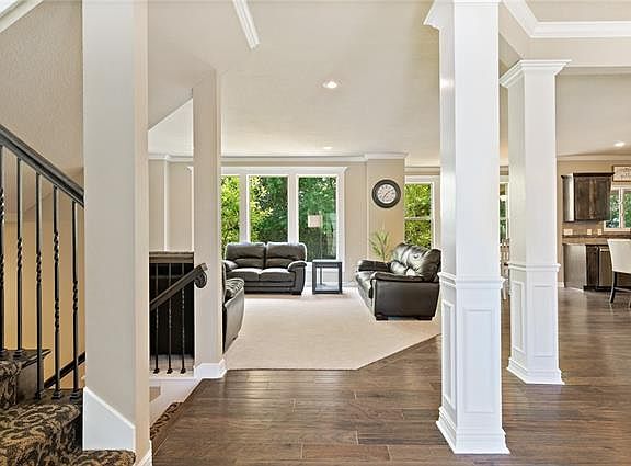 PRICE CHANGE! And, fresh paint in the lower level & garage. Custom Preston Ridge II has great curb appeal, welcoming front porch. Step into a beautiful home with open plan, wood floor entry & formal dining, through to breakfast room & kitchen. Great room with fireplace and large windows overlooking private backyard with mature trees at back boundary. Kitchen has large island, walk-in pantry, granite counters, s/s appliances. Mud room space off garage is great drop zone, 1/2 bath completes main level. Wide staircase up to 2nd level with new carpet. 3 very large bedrooms, 1 has private bath, 2 others share bath. Primary suite at end of hall is very large with custom bath-heated tile, HUGE fully tiled walk-in shower, dbl vanity & big walk-in closet with direct access to spacious laundry room. All baths have tile floors. Stairs to lower level open to large family room with tall ceilings and great lighting. Full bath with tiled shower on this level, as well as a very large 5th bedroom with fantastic closet. From the breakfast area you can access large covered patio. Landscape beds have river rock instead of mulch! Black metal fence around backyard, mature landscape & mature trees beyond the fence provide rare privacy. Remaining time of the 2-10 structural warranty will transfer to new owner at closing.