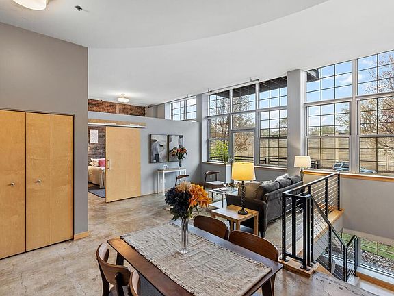 Stunning two level loft in the unique Brookside lofts - prime location, too. On the back side of 50th & France and close to West End and Excelsior on Grand...this is a renovated school from the 40's with its unique character - brick walls, concrete floors, high ceilings. Sunlight abounds thru the wall of windows on the East side of the building. The main level is open and airy - open kitchen, dining and living area with a sliding door to the owner's room with a large walk in closet. The east facing deck is great for a morning cup of coffee. The lower level has a family room and another large bedroom with walk in closet. There is a full bath on the landing to the attached garage. This home has 2 stall garage! This building is phenomenal as each unit is different - very quiet building - hurry to call this home!