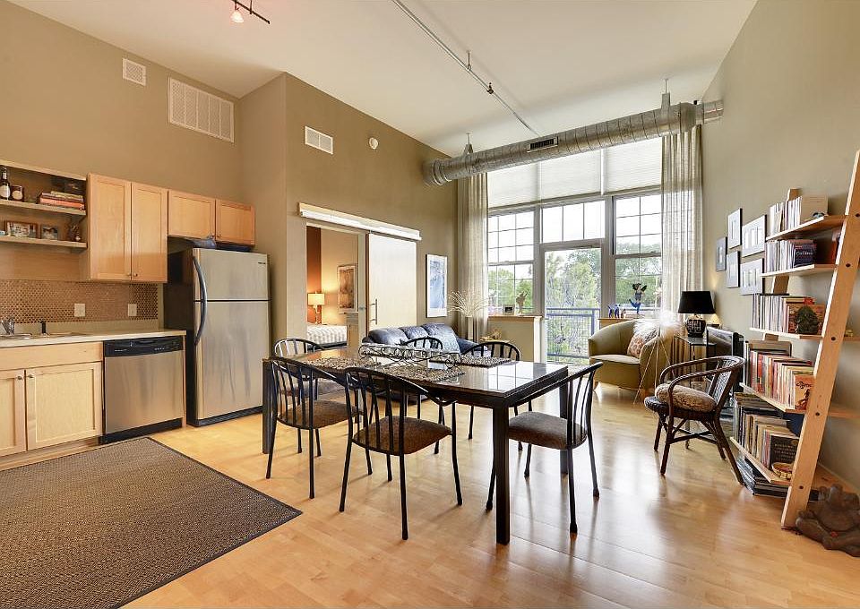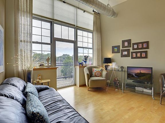 Chic upscale loft with open floor plan in historic converted Brookside School Building. Solid concrete and brick construction, terrazzo floors, stainless appliances, washer and dryer in unit, enormous great room, walls of windows, lots of light, balcony with room for sitting, pets allowed, elevator, security bldg., heated underground garage stall, near Excelsior & Grand, 50th and France, bike trails, easy access to downtown Mpls., West End, less than half the price of downtown condos.