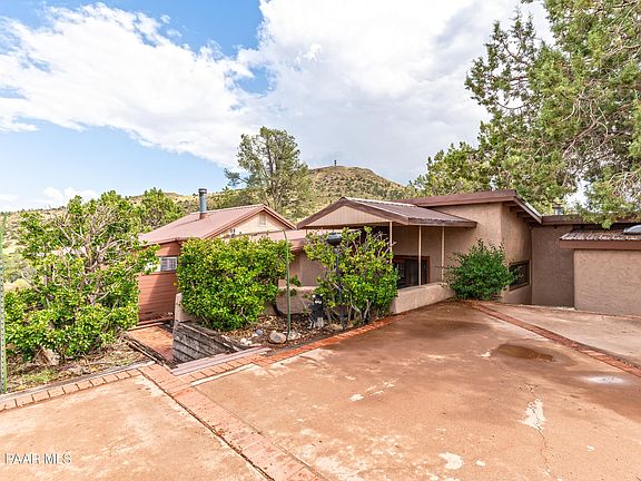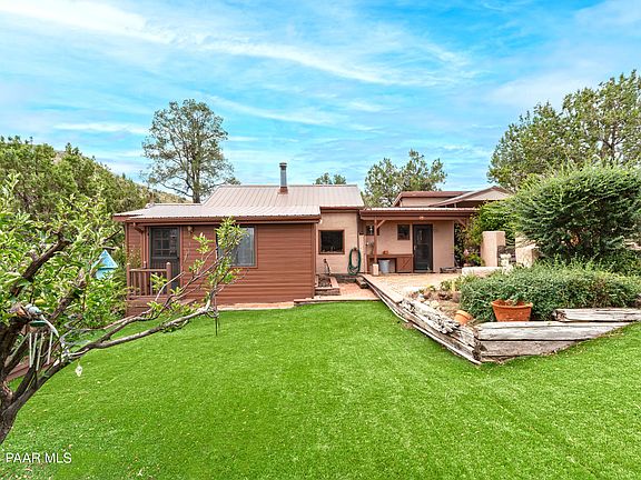 This unique home and property has so much to offer! Originally on land owned by the railroad, the main home started off as a relocated school house from Camp Wood. Main home features 2 owner suites, hardwood floors, artisan southwestern details, stained glass windows, vaulted wood ceilings and a wood burning fireplace. Don't miss the spa room just off the owner suite- its your own personal oasis. Need extra room for family, friends, or a rental? Guest home on property is just over 1000 sq ft. Just as charming as the main home, the guest home features kitchenette, living room, bedroom, bath, bonus work or craft space with loads of storage. Enjoy 5 fenced acres with two 15x15 stalls, 2 area mare motel, feed room and tack room. Ride out to state trust land for miles of enjoyment.