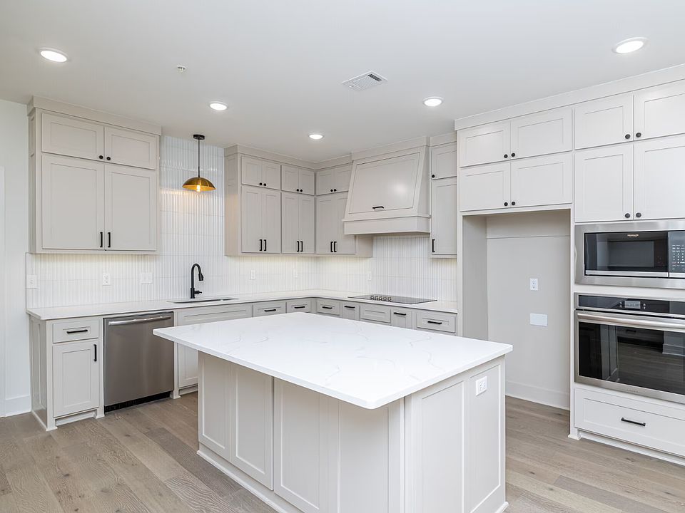 Boasting real wood flooring throughout, giving each townhome a warm and luxurious feel, while the custom cabinetry adds both functionality and sophistication. Highlights of the kitchen include the custom coffee bar and large island perfect for morning routines or entertaining guests.