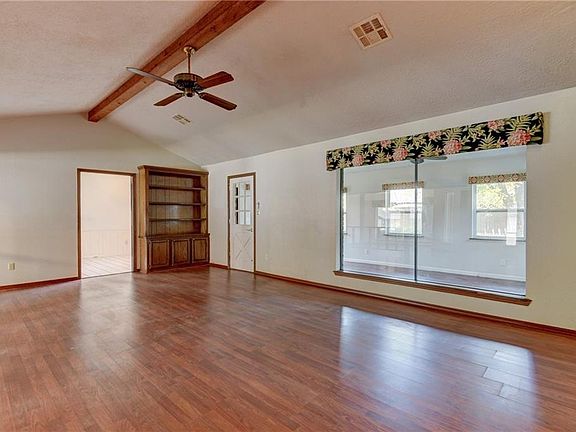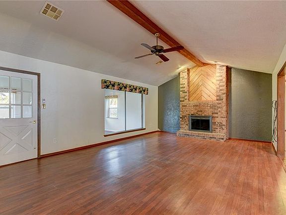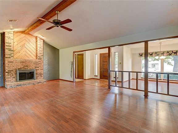 This amazing home offers tons of space and features. The large living room boasts vaulted ceilings with a wood beam, cozy brick fireplace, and built in bookshelves. The updated kitchen provides tons of counter and cabinet space, pantry, and eating space and is attached to the inside laundry room. The master suite is a true oasis with double vanities, walk in closet, and tile shower. The formal dining looks over that beautiful living room while a secondary living space has tons of bright windows that show off the large, green backyard with mature trees and new patio!