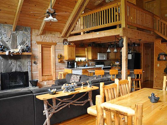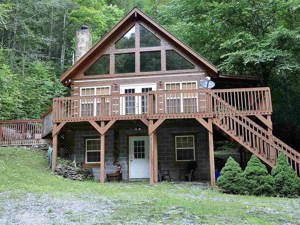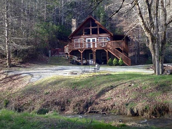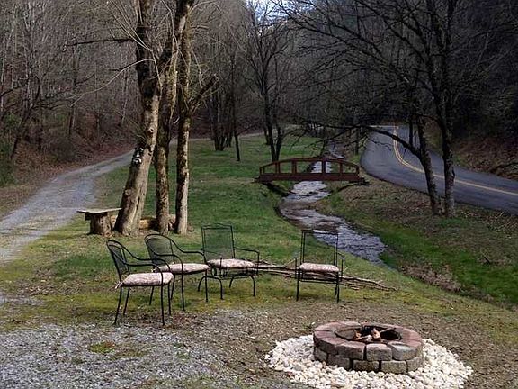 Price Reduced! Cozy 2bd/2ba Creek-front Cabin on 3.99 acres! Unwind on the deck while hearing the relaxing sounds of the creek below or sit by the fire pit adjacent to the creek bridge. Beautiful stone fireplace in living room with lots of natural lighting, all wood; ceiling, floors and walls. Located in a quiet area with both overnight rental and permanent homes. This cabin would do great on a rental program or keep as a second home. You'll love the peaceful setting!