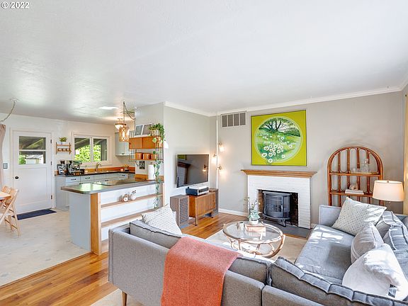 This adorable ranch home will steal your heart! Original wood floors, updated double-pane windows, tiled shower, & open-concept, eat-in kitchen w/ stainless appliances. Attached garage conversion boasts flexible guest room/office with separate entrance, storage, laundry, and workshop. Beautiful trees, incl. delicious espaliered apples and pears! Stunning backyard perfect for entertaining and relaxing w/ flowers, fenced garden, shed, & huge covered patio w/hot tub. Ready to start making memories! [Home Energy Score = 3. HES Report at https://rpt.greenbuildingregistry.com/hes/OR10184026]
