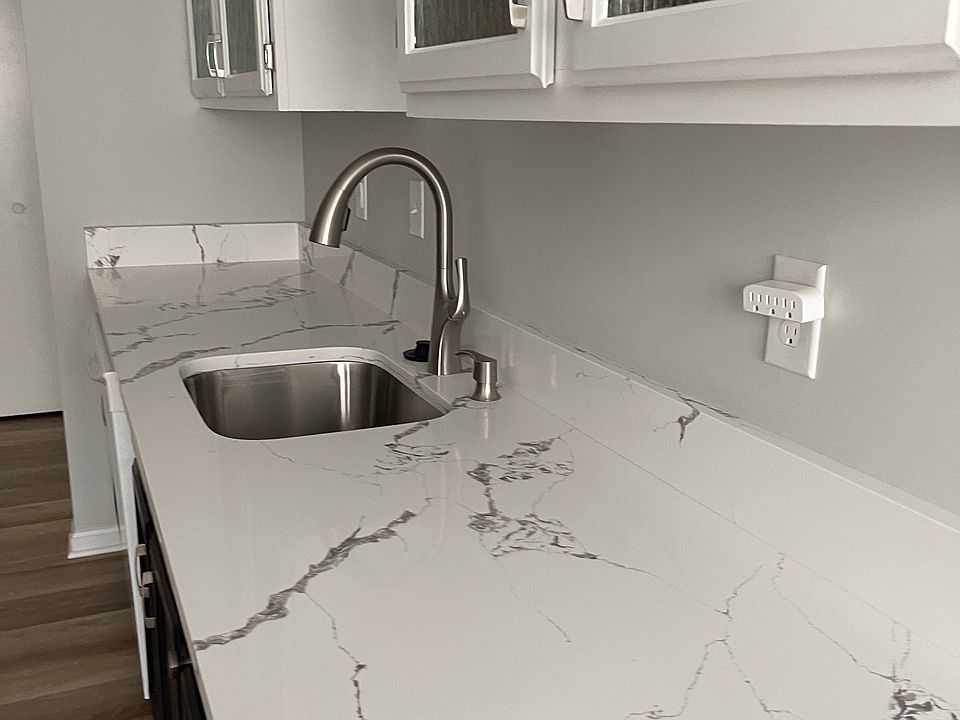 Inside, you'll find **new floors, toilets, and a marble shower along with **tons of closet space** for effortless organization. The stylish kitchen boasts **new rainfall glass cabinet doors ** a new food disposal and **stunning new quartz countertops** that uniquely elevate the entire space.