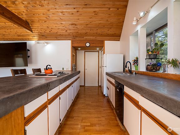 Wonderful artistic home surrounded by 2 greenbelts! You are welcomed into a grand living room and entertaning kitchen, featuring new concrete counter tops. Soaring cedar lined vaulted ceilings and skylights to bring in lots of light. Birch floors throughout living area, and new vinyl plank flooring.. Unique art stained concrete floor in family room. Relax with with a book in the sunroom! Primary located on main, private en-suite bedroom located on upper floor. Secondary bedroom with a loft overlooking the main living area. Located on a quiet cul-de-sac in desired Skyline community with beach access, club house, tennis courts and more. Brand new oven, roof 7 years. Low maintenance fenced front yard! Come make this home yours!!!