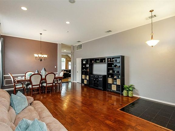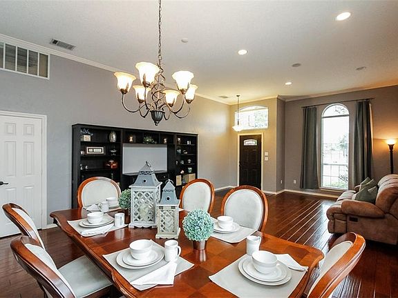 Beautifully updated home with pool & outdoor FP!Electric gate & swing drive rear entry garage.Wood flooring in formal areas; travertine & accent border in foyer, kitchen, breakfast & family.Kitchen features breakfast bar, BI microwave, stainless appls,granite counters,12-inch tile backsplash, track lighting & WI pantry.Family room has gas log FP,wine bar,mounted speakers & c-fan.Updated master bath has new sinks,tiled shower & granite counters.