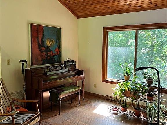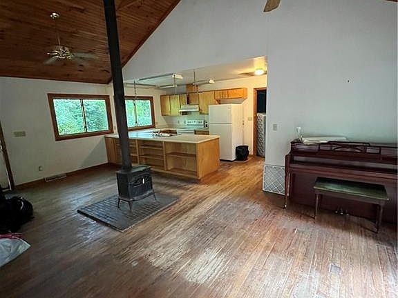 A little cabin in the woods. Built as a downsize home and contains everything one needs. A great starter home or downsize or use for short/long term rental. Large Living Room/Dining/Kitchen with Cathedral Ceilings - exposed beams with tongue and groove pine. Woodstove in main living area. Spacious kitchen with plenty of workspace and cabinets for storage. Bedroom features double closets and private screened porch. Deck/patio door from living room overlooks wooded back yard. Situated on 4 acres with a deeded easement access/driveway. Property being sold as is and priced accordingly.
