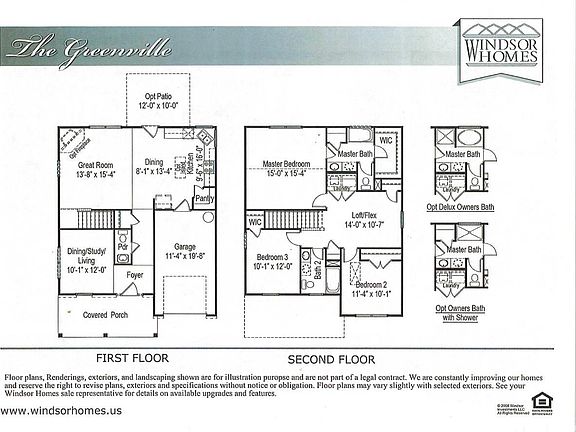 Greenville Plan by Windsor Homes. 3 Bedrooms, Loft and 1 car garage. Kitchen has grey painted cabinets, granite countertops, island, stainless appliances and breakfast area. Coffered ceiling in formal dining room and corner fireplace in great room. Master suite has cathedral ceiling, walk-in closet and deluxe bath with double vanities, garden tub and separate shower. Wrought iron pickets on stairs. Upstairs loft and 2 additional bedrooms.