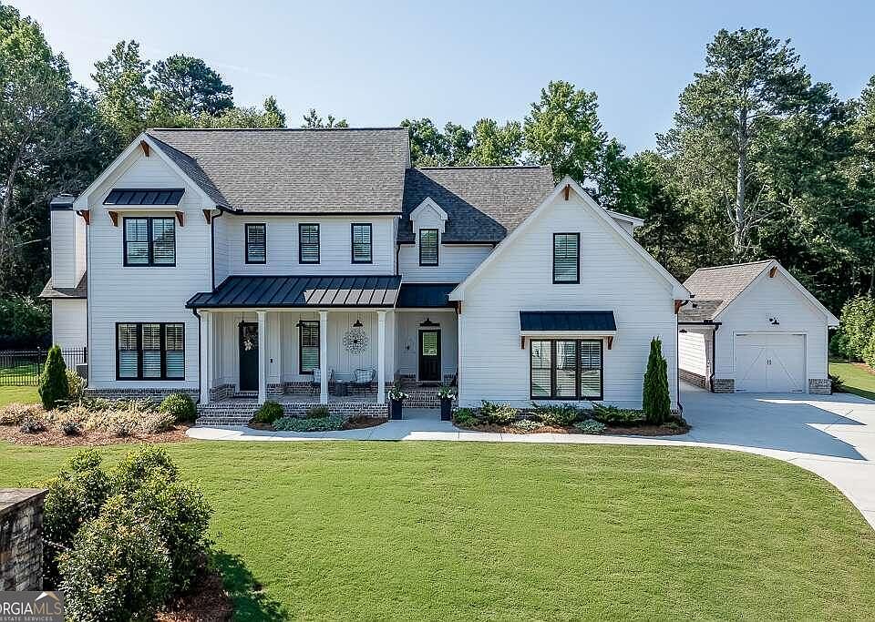 PRICED $100,000 UNDER recent BANK APPRAISAL!! This modern farmhouse, built in 2021, is nestled on a .8-acre lot in an exclusive gated community of only 8 homes set on 25 acres of stunning property. Surrounded by 133 privacy trees and lush shrubbery, the fully irrigated and sodded lot offers both beauty and seclusion. This home features 5 bedrooms and 4 full baths. The exterior is constructed with concrete siding and brick, ensuring low maintenance. Inside, the open floor plan seamlessly flows from the kitchen to the family room, where large accordion-style sliding glass doors open to a covered patio. This creates a seamless indoor-outdoor living experience, perfect for entertaining with outdoor seating, a fireplace, and a mounted TV. The living area includes a gas fireplace with shiplap and brick accents. The large kitchen is equipped with an oversized island, floor-to-ceiling cabinets, a hidden walk-in pantry with a granite countertop, GE Cafe stainless steel appliances, and quartz and granite surfaces throughout. The home boasts 10 ft ceilings throughout. The main level includes the master suite, an additional bedroom, and a full bath. The master ensuite features a huge walk-in shower with a rain shower head and a freestanding bathtub. The first floor is adorned with luxury plank flooring throughout and beamed ceilings enhancing both the den and the master bedroom. Plantation shutters and shades are featured throughout the home. On the upper floor, you will find one bedroom with an ensuite, an additional bedroom, a full bath, and a large bonus room that can serve as a 5th bedroom. The fully fenced yard is enclosed with black iron fencing. Ample parking for you and all your guests includes a 2-car side entry garage and a 14 x 30 carriage house-style garage, ideal for a boat or workshop. Both garages have custom wood cabinetry installed. Experience luxury living in this modern farmhouse, situated in a serene and exclusive community. Don't miss the 5 acre HOA area with private pond and fountain.