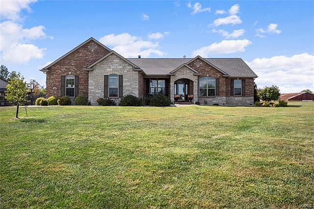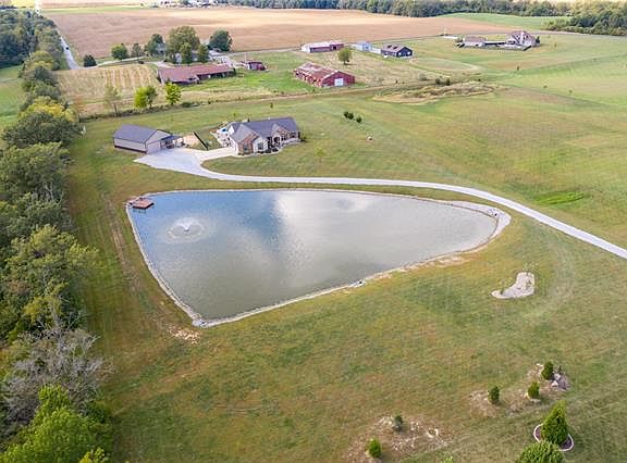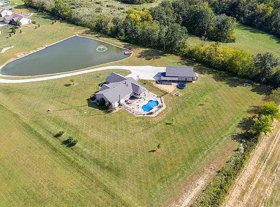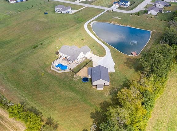 A 5 Bedroom 4 bathroom home hosts a stocked lake w/fountain & heated saltwater in-ground pool all on 5.03 Acres! Pull into either your tandem 4 car detached garage w/bathroom, heating & ceiling fans & covered patio or your 2 car attached side entry garage w/pebble Epoxy floor. Enter into the foyer. Formal dining room currently an office, opens to Your living room w/vaulted ceiling, gas fireplace w/built-ins. Kitchen w/ granite counter-tops includes all S.S. appliances, Breakfast bar, Breakfast room, walk-in pantry & other side of gas fireplace. Half bath & laundry room w/doggy door. Master bedroom suite w/dual vanity, garden tub, separate shower & walk-in closet. Hall has a full bath & linen closet. Bedroom 2 currently a gym, bedroom 3 hosts built-in bookcases & bench. Lower lever hosts Massive great room w/wood burning fireplace w/blower, Wet bar, Full bath & 2 additional bedrooms. Backyard Oasis w/covered patio w/ceiling fan, stamped concrete patio, fire pit & beach area.