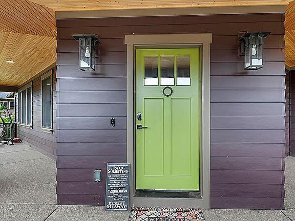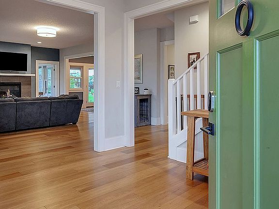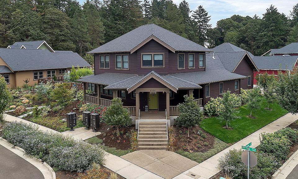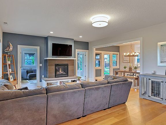 Craftsman style 4-bed, 2.5-bath home on double corner lot has gorgeous outdoor space with garden paths, fire pits, trees, shrubs and lawn, and covered patio. Inside is the living room with gas fireplace; kitchen with stainless appliances, quartz counters and eat-in island; dining area; main floor master with fabulous ensuite bath; laundry room with mudroom area and den/office. Upstairs are 3 bedrooms, a full bath and a large family room. Beautiful engineered wood floors and new honeycomb blinds throughout.