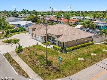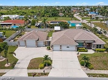 Enjoy this spacious oversized lot. This home offers privacy yet plenty of storage. Perfect location for biking to downtown Cape Coral or yacht club yet minutes from Ft Myers. Close to All amenities that Cape Coral has to offer. This unique pool home is Perfect for your family, or much needed extra space to work from home or can provide extra storage space to rent or VRBO that has a central location while using the detached garage for your business. (Furniture is being offered as optional) The 3-car garage of 1,377 sq ft has a 12 ft lift with air compressor. Positioned on a .4-acre lot, the open split floor plan Has the sense of spaciousness yet homey. Enjoy privacy in the backyard with an enclosed vinyl fence that has 10ft wide gate providing access to an over large back yard or additional storage. Step inside to featuring vaulted ceilings, led lighting with crown molding, & 6in baseboards. The over large master bedroom showcases a walk-in closet, jacuzzi tub & an over large walk-in shower. Marble flooring in the main area and tile in bedrooms. Recent upgrades include a new roof 2022, A/C 2020, double pane windows and New fiberglass double entry door, roll-down hurricane shutters and 6 exterior cameras for enhanced safety. The Oasis backyard is like no other, a generous back lanai with a volleyball heated pool & newly designed rubber deck. This home is Not in a flood zone all assessments are Paid. Enjoy your piece of paradise.