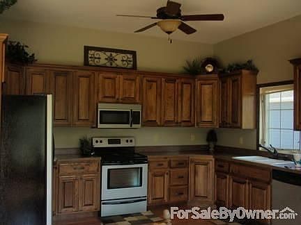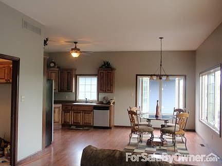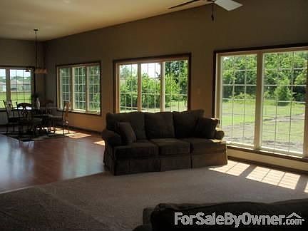 Experience the warm, inviting feeling of this open floor plan when you walk through the door. Whether your desire is to be together as a family, entertaining or both, you'll see that this is the perfect home for that. This home has 1725 square feet on the main level with an unfinished basemenet for a lot of expansion. There are three bedrooms and two bathrooms with a large master bedroom. The master bedroom has as coffered ceilings and a large walk-in closet. The master bathroom is a room anyone would love to relax in, with it's large spa tub. Large windows across the entire back of the open living area are a fantastic feature that looks out to an expanse of timber, where you can watch passing deer and a fox now and then, rather than the back of another house. The double garage has a pull down staircase that opens up to storage space the size of the enire garage. Shop around, then make an appointment to visit this home. You'll see the difference the minute you walk in the door and your decision will become much easier. Call 785/449-2181 to make an appointment.