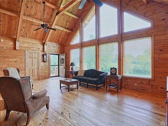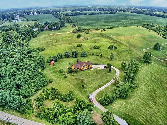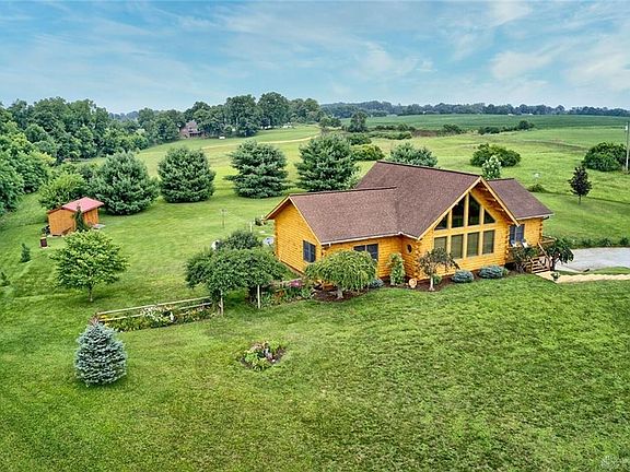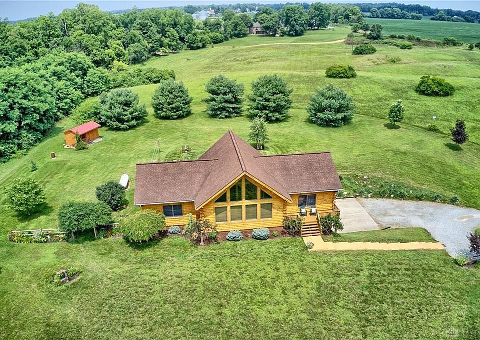 Amazing property w/a log cabin home on 10 acres of rolling land in Elizabeth Township/Miami East School District. The workmanship of this Amish built home by Kuhns Brothers you must see to appreciate. Home features an open floor plan w/cathedral ceilings, exposed beams & refinished beautiful hardwood floors throughout. Oversized master bedroom includes a walk-In closet & on suite bath. The second bedroom also includes an on suite full bath. The 25'x16' loft could be used a bedroom. Laundry/mud room on the main level. The basement opens to the garage making it an ideal area for a workshop while still leaving an abundance of space for storage plus area to finish for a rec room. Updates include furnace 2019, refinished hardwood floors 2021 & refinished exterior 2021. Enjoy countryside hilltop views from the front porch & a back pergola covered paver patio for backyard entertaining. If you've been looking for a home in the country this could be the one you've been waiting for.