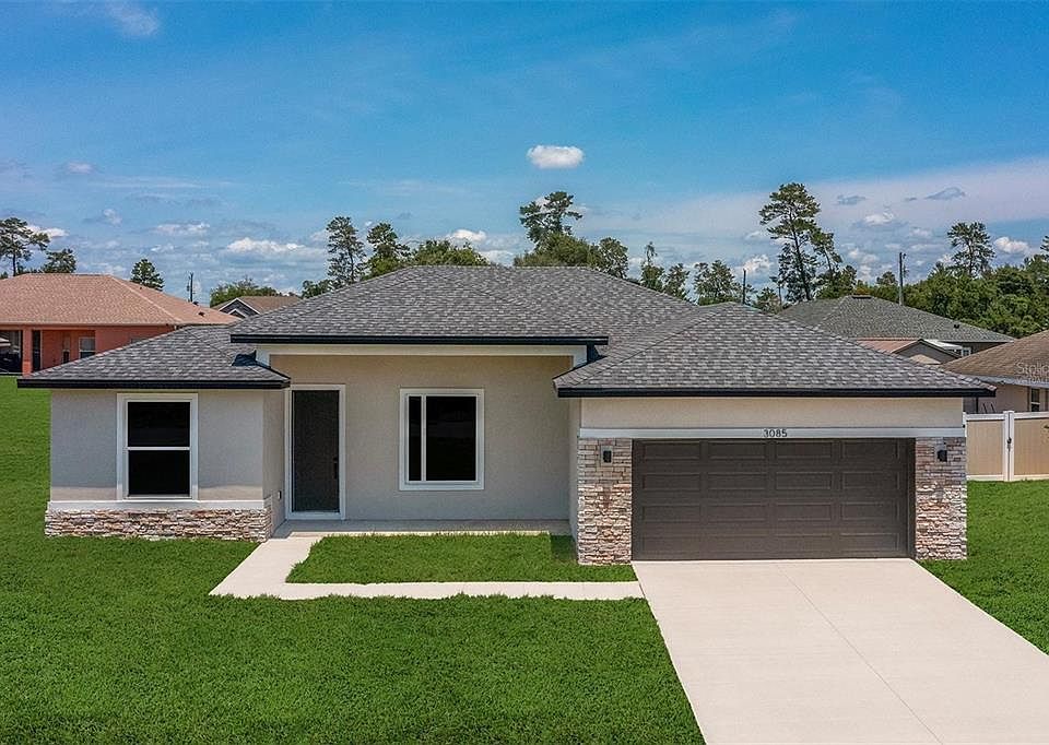 One or more photo(s) has been virtually staged. Under Construction. BUILDER WILL CONTRIBUTE UP TO $5,000 TOWARDS BUYERS' CLOSING COSTS/PRE-PAIDS AND/OR A MORTGAGE RATE BUY-DOWN (with a Preferred Lender). BIMINI - This amazing home boasts a large, open floor plan with tall ceilings, plenty of windows, and an 8-foot slider, creating a bright, airy, and open feeling. This elegant home offers 3 Generous sized bedrooms and 2 full baths. Enter the home to a massive great room including a spacious dining area that opens to the kitchen. The large chef’s kitchen overlooks the great room and dining area and features quartz counters atop solid wood cabinets with soft-closing doors and drawers, embellished with elegant hardware. A large, centered island completes this dream room. Just off the kitchen is a walk-in pantry and laundry room. The Primary bedroom is spacious and features a top-tier bathroom with a tiled walk-in shower, dual sinks, a massive walk-in closet, and a separate room with a walk-in toilet for added privacy. There are two more spacious bedrooms, one with a tub and shower, and both with dual vanities. The entire family can comfortably spread out in the expansive great room. The home features solid surface flooring throughout for easy cleaning, upgraded raised-height vanities, and toilets in all bathrooms. There is a covered front porch for your enjoyment, as well as an extra-large covered rear lanai, perfect for enjoying the Florida weather in privacy. Don't miss out on this incredible opportunity to own this beautiful home. Call Today!!! Please check in at our model homes, located at 13392 SW 63rd Terrace, Ocala, FL 34473 or 5069 SW 109th Loop, Ocala, FL 34476, just off SW 49th Avenue in Ocala Waterways.