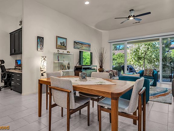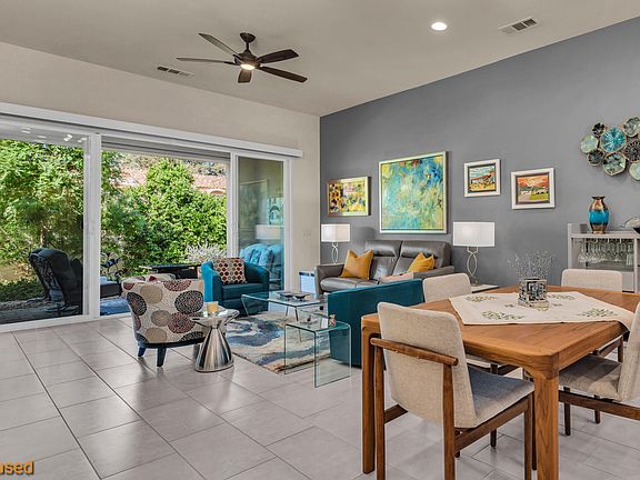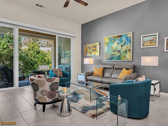 Welcome home to Villa Portofino. The desert's premier 55 or better community located in the heart of Palm Desert. Contemporary, stylish and elegance personify this single level Villa Portofino solar powered 1610 square foot, two bdrm, two bath home with oversized single car garage. The large open and bright great room features sliding doors to welcome you to the outdoors to enjoy your very private lush backyard. The kitchen is highlighted by a large island that is perfect for entertaining. Eat, drink or entertain under the stars in your interior courtyard with retractable awning. The bedrooms are well separated allowing for a restful night. The Master suite is bright and airy with access to your private patio. Numerous upgrades include quartz counters, tile floors, newer carpet, SS top of the line appliances, oversized laundry room with upper and lower cabinets and sink, remote controlled electric blinds and sunshade on patio, pull outs in cabinets, designer paint and more. A short walk from your front door and you are at all your resort style amenities from an on-site movie theater, yoga studio, gym, bistro, bocce ball court, bar, library, billiards room and some of the best mountain views the desert has to offer.