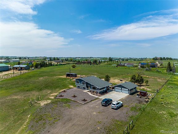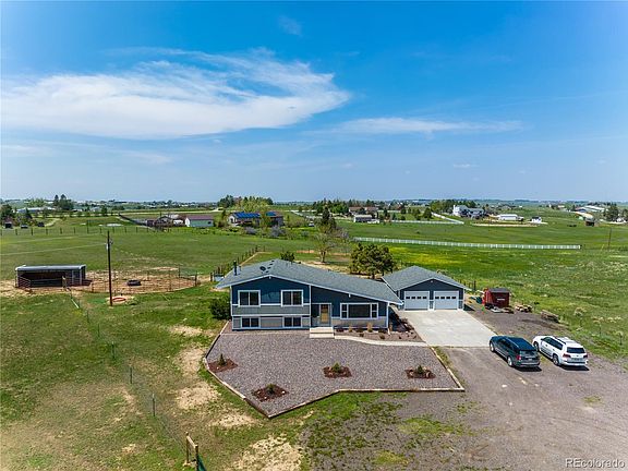 With unforgettable sunsets, mountain views, five acres of Colorado country perfection, and masterful finishings throughout this impeccable three-bedroom, two-bathroom oasis, this home is a homeowner’s dream come true. Thoughtful amenities and attention to detail are present at every turn on this property from outdoors to indoors, including (and by no means limited to): entering through a fully fenced electric powered gate, entertainment space on a 33’ x 15’ paver patio, new exterior paint, designed landscape, horse shed, corrals, hot tub, oversized two-car garage, RV parking, a yard hydrant, chicken coop, large fenced dog run, and so much more throughout the usable space. Inside, you will fall in love with the open layout created by removing walls in the primary and downstairs spaces, gorgeous ceiling beams, remodeled kitchen, a master bedroom with a private deck, wood burning stove, and a bar with a statement brick backdrop in the family room, barn doors, refinished cabinetry, new windows, new water heater, and an awe-striking set of newly added floating stairs made from antique wood from an old semi-truck. All this and so much more, such as no water or propane bills and being situated only 20 minutes from downtown Parker, make this home the epitome of an ownership opportunity of the utmost stunning and unique property.