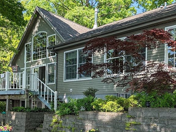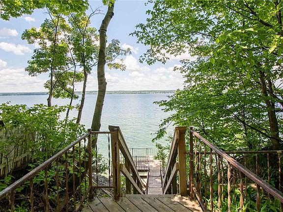 Welcome to this solid, custom-designed, year-round lake home. It sits on the East shore of Seneca Lake with its breathtaking sunsets. There are lake views from every room. This over half acre mature and landscaped lot has 103' of lake frontage. The slate tiled foyer welcomes you into the oak hardwood great room with its wall of windows offering a spectacular view and a spacious loft space. This open floor plan features a cast iron gas stove, dining space, a kitchen with a pass-through window to the year-round sunroom that leads out to a wrap-around deck. The master bedroom has a walk-in closet and full bath. The den has lakeview with bay window and nearby full bath. The first-floor laundry is convenient to the garage that has the boater in mind with an extra deep bay. The walk-out lower level has lake views from the bedroom and a large bathroom. There is a workshop and spacious open area on the lower level with two small storage areas, perhaps wine cellar space. The private stair tower brings you to the 50’ seasonal dock with an electric winch boat lift. New roof July 2021. Municipal water. Near many Finger Lakes wineries.