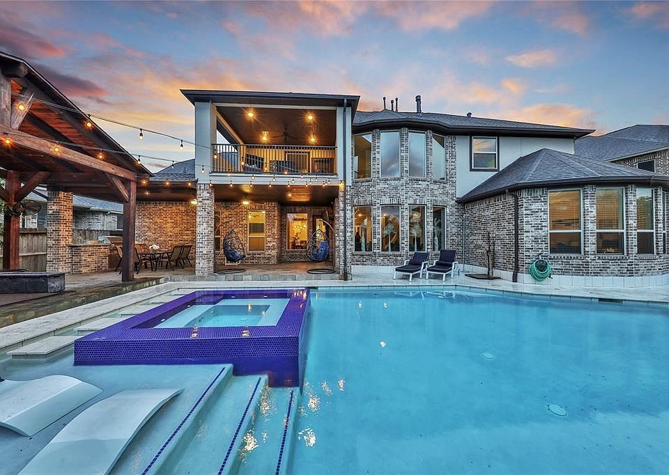 Executive Style Living in a gated area of Benders Landing Estates with Oasis style backyard and gorgeous backyard, outdoor patio, outdoor kitchen and resort style POOL. Beautiful two story entry with winding staircase to the open & airy living room with full windows to view the resort style backyard. Gourmet kitchen with extra large island, sitting for six, 42" range w/pot filler, beautiful cabinets, all upgrade appl, built-in fridge & walk-in pantry. Xtra Lg Master Suite with gas fireplace and built-in TV, split vanities, double shower plus tub & an amazing walk-in closet with built-ins, safe & make-up area. Second guest suite down with adjoining bath. Upstairs Game Room for pool table, sitting area plus media room, and secret closet. Three spacious bedrooms w/adjoining baths & outside balcony. Think Lock-n-Leave! You're minutes from the airport!