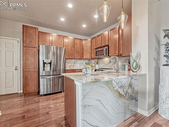 Original Owner, Pet Free, Smoke Free, and Shoe Free!! * If you travel, Lock up, Leave, and Don't worry about a Thing! No shoveling or yard work to worry about! Beautiful and bright end unit townhome with central air and dual primary suites that has been completely updated * One of the nicest townhomes in this price range, nothing needs to be done except moving in! * As you enter, you are greeted by an open floor plan with updated LVP flooring in the living room and dining room * Spacious living room with gas fireplace with new stone surround, built-ins, and an in-wall wire conduit * The kitchen features stainless steel appliances with an updated range oven and fridge, quartzite counters and backsplash, updated pendant lighting, a pantry, and wood flooring * Spacious Primary bedroom #1 with custom built-in's, a walk-in closet, and updated 5-piece bath with large soaking tub, double sink vanity with a quartzite counter, beautiful updated lighting, and standalone shower with bench * Sizable Primary Bedroom #2 with vaulted ceilings and an adjoining 5-piece bath with updated lighting, a double sink vanity with a quartzite counter, large soaking tub, standalone shower, and large walk-in closet! * Laundry room are also on the upper level * Additional features of this home include central air, recessed lighting, a finished 2-car garage, upgraded carpeting, 6-panel doors, vaulted ceilings, Pella Storm Door, window coverings, new faucets, new comfort height toilets, updated lighting, under stair storage, and a security system (hardware) * You will enjoy relaxing on the covered front porch that faces southeast * Steps away from Cottonwood Park, Cottonwood Rec Center, and Trails and conveniently located near Shopping, Restaurants, Schools, and Peterson AFB.
