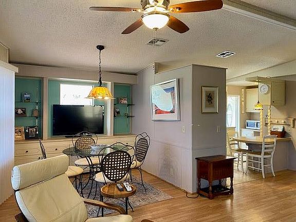Beautifully landscaped 2 BR 2 BA home in 55+ community of Colony Cove. Unique layout with lots of storage space! The flooring throughout the home is in good condition and clean. The kitchen has light cabinets, white appliances, and a cute breakfast bar. Open concept to the large living room with ceiling fan, lots of windows for added light, and there are sliders onto a spacious tile floored lanai. The dining area is off the living room with space for a large round table and has tons of built-in cabinets for storage. The guest room has a ceiling fan and room for a queen bedroom set. It also has a large closet and bathroom nearby. The Master bedroom has an en-suite bath with double vanity sinks and built-in cabinets/shelving. **Disclaimer - the home needs a new AC and the seller will give allowance towards this. Lot rent is ***$945.49. This home comes partially furnished. Colony Cove is a 55+ community with 5 clubhouses, 5 pools, a fitness room, library, game room, billiard room, pavilion, and shuffleboard courts. Pet-friendly offering a large dog park with views of the Manatee River. In addition, this park also has a private boat dock with fishing along with a marina with Gulf access. Close to restaurants and shopping areas making it convenient for seasonal and full-time residents. Please do not miss this opportunity, this could be your dream home! All listing information is deemed reliable but not guaranteed and should be independently verified through personal inspection by appropriate professionals. Integrity Mobile Home Sales cannot guarantee or warrant the accuracy of this information, measurements or condition of any property. Measurements are approximate. Lot rent subject to change.