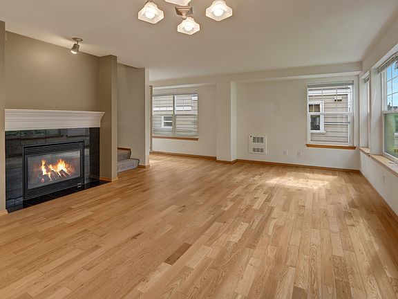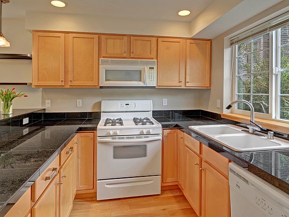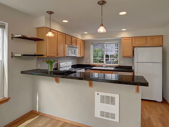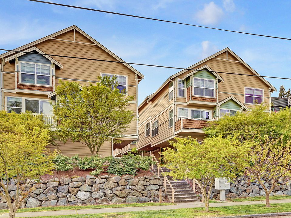 This beautiful end-unit townhome is flooded with natural light! First floor boasts slate entry, garage and bedroom with slider to patio. Surrounded by windows, the spacious main floor offers a full bath, office nook, gas fireplace and hardwoods. Open kitchen features granite tile counters, pantry & bar. Upstairs has full size w/d and 2 master suites with vaulted ceilings, each with its own full bath & walk-in closet! Truly a perfect layout & no HOA dues. Stroll to Fremont, Wallingford and Greenlake!
