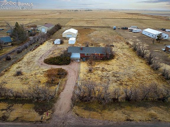 Mid-century brick rancher located on a partially fenced 4.82 acre lot in the Manila Village neighborhood of Bennett, CO. 3BRs, 2BAs, and 1296 sf of living space. Central air and heat for year-round comfort. Beautiful wood laminate floors through the Entry and Dining Room. The Living Room features a lighted ceiling fan and wood burning fireplace with brick surround and raised hearth. The formal Dining Room has convenient Kitchen access making it easy to serve meals and entertain. The Kitchen provides a vinyl floor and wood cabinets with ample countertops for storage and easy food preparation. Appliances include a gas range oven, vent fan, dishwasher, and refrigerator. The Primary Bedroom is an owner's retreat with an adjoining Shower Bathroom that includes a vanity, mirrored medicine cabinet, cabinet, and enclosed tiled shower. A 2nd bedroom shares a full Guest Bathroom with vanity, mirrored medicine cabinet, over the toilet shelf, and tub. There is room for expansion in the unfinished 1296 sf Basement. The Laundry Area is also in the Basement with a washer and dryer that stays. For the car enthusiast or buyer looking for an onsite workshop, this is the place! There is a 2-car attached garage with door opener and storage, a 6-car and two 1-car detached garages on the property. These are great buildings for cars, boats, workshops, tools, and toys. Newer septic system. No HOA. There is plenty of room to add pens, barns, and corrals for your family pets. Enjoy rural living with city conveniences such as parks, schools, and shopping just minutes away.