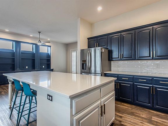 This meticulously maintained and spacious residence welcomes you with stunning luxury vinyl plank flooring, lofty ceilings, and expansive windows that flood the space with natural light. The kitchen underwent a stylish upgrade in 2022, featuring chic navy blue cabinets, pristine white quartz countertops, classic white subway tile backsplash, and a generously sized island measuring 4'3" X 9'5", providing ample seating for eight. This renovation also introduced brand new Kenmore appliances and a deep farmhouse sink, with the refrigerator included in the sale. The main level offers additional amenities including a well-appointed laundry room with ample storage and a sink, a study, two distinct living areas, and a luxurious primary suite boasting double vanities, a spacious shower, and a large closet with built-in organizers.